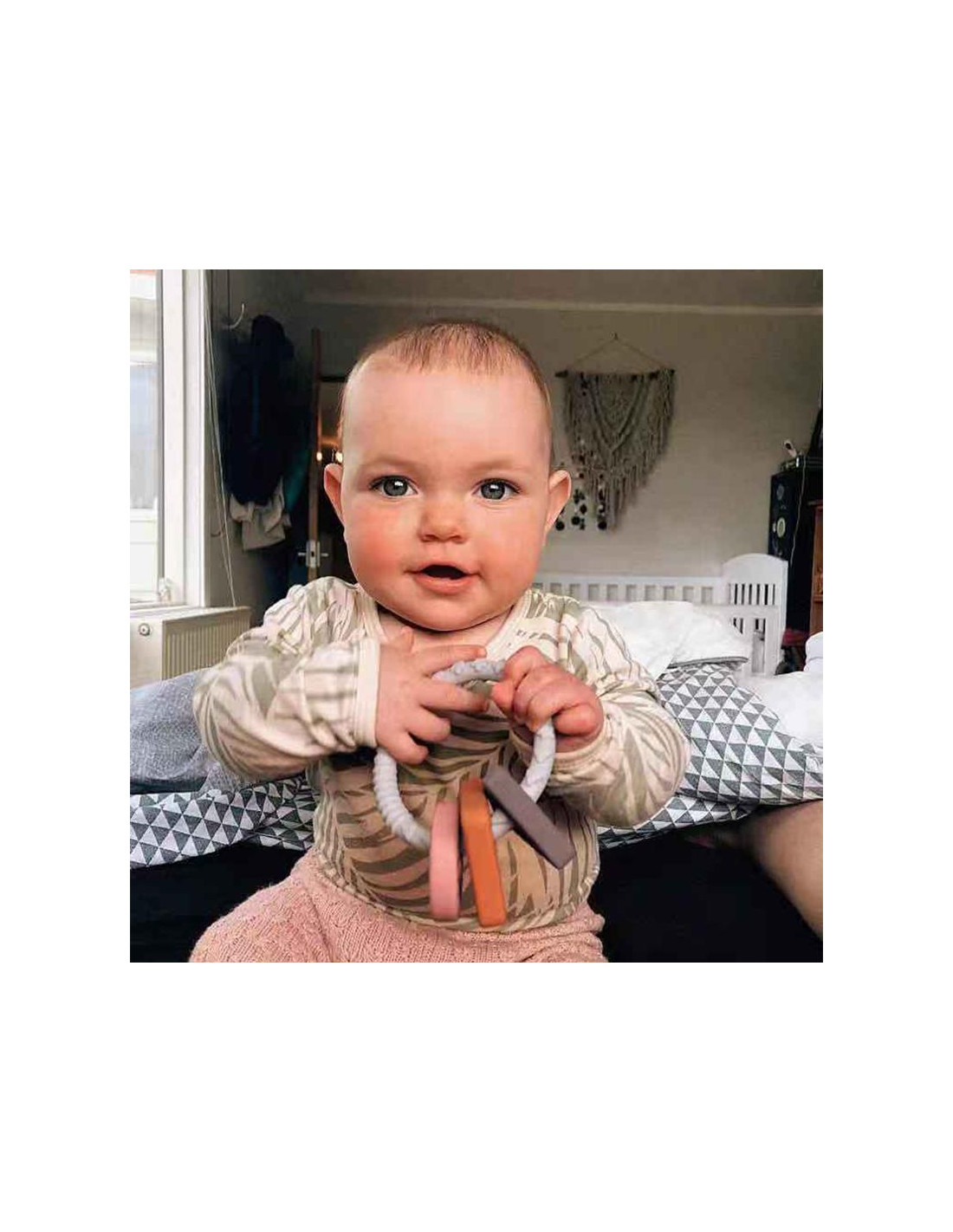 Unser speziell entwickelter Beißring ist BPA-frei, FDA-zertifiziert und besteht aus biegsamem, lebensmittelechtem Silikon. Silikon ist hypoallergen und nicht porös – also ideal und sicher für zahnende Babys. Das strukturierte Design mit Rillen fördert außerdem die motorische Entwicklung deines Babys und sorgt gleichzeitig für sanfte Linderung bei schmerzenden Zahnfleischstellen und neuen Zähnchen.